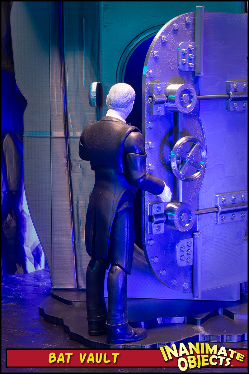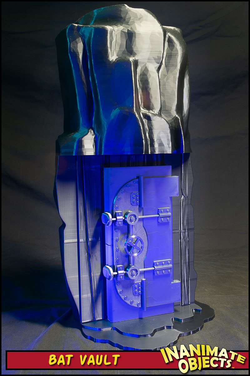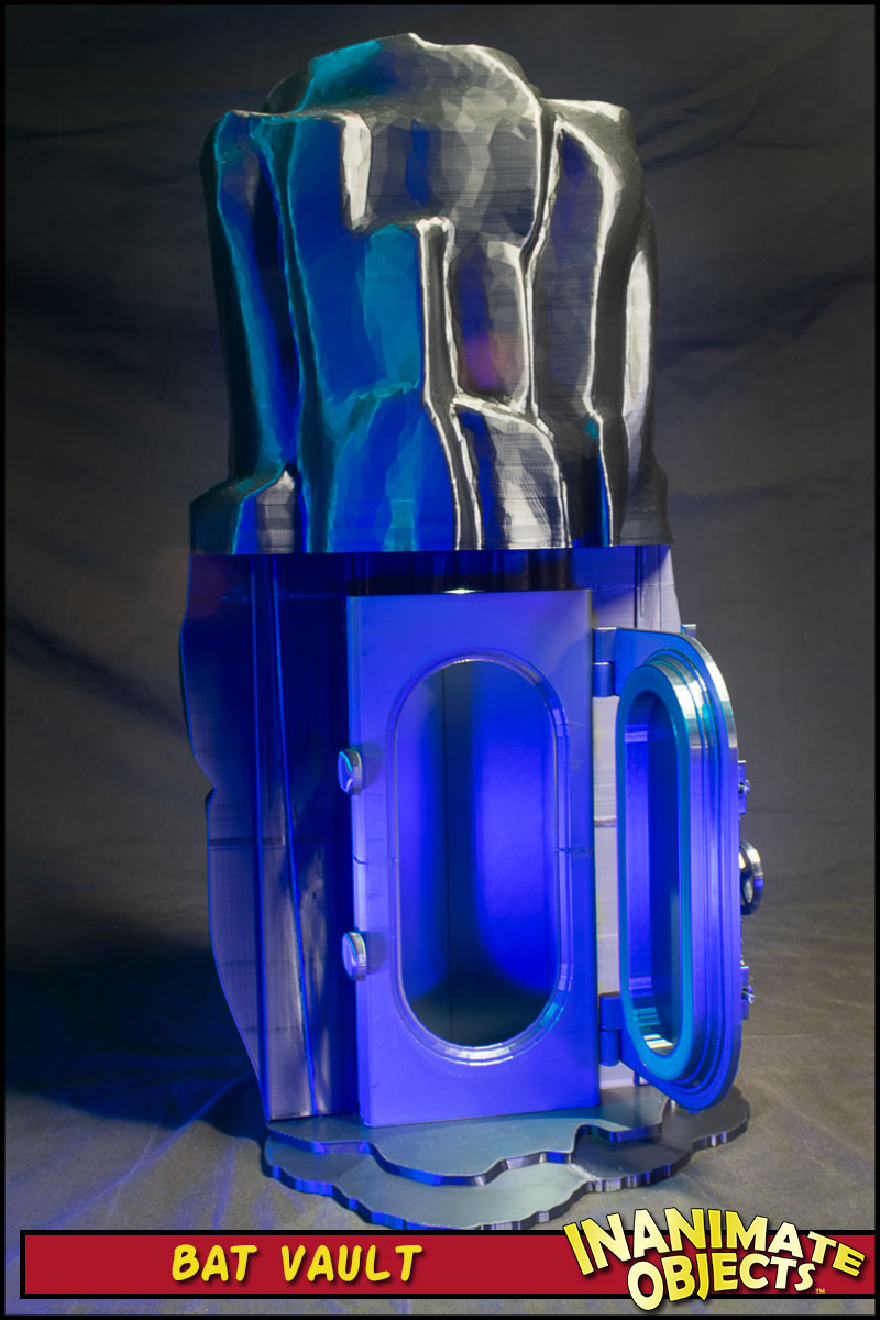 In the film, the Batsuit vault is just below the deck. Why not add that? Again, multiple versions exist. I opted for the one created by Ryan Myers on Cults3D because it was a decent balance between screen accuracy and printing practicality. I used the cave walls to create a pillar, and merged the vault into that. I left a small hole in the back that allows me to drop in a small puck light to illuminate the vault interior.